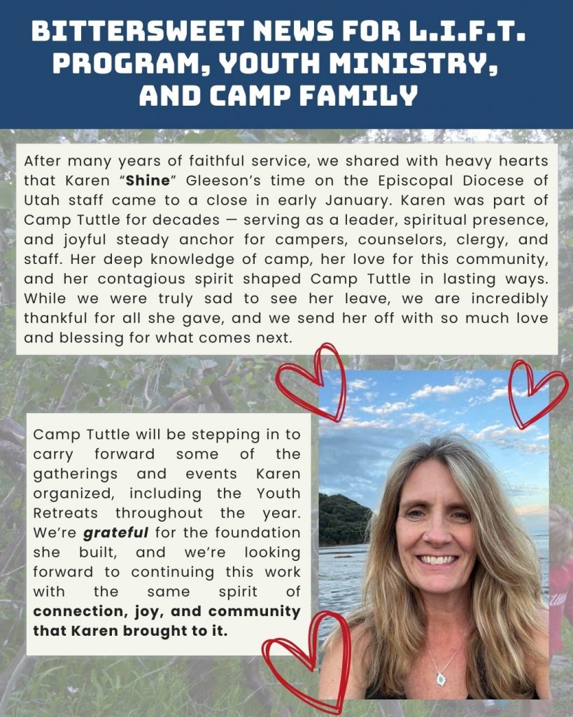 Established in 1958 as a ministry of The Episcopal Diocese of Utah, Tuttle is a non-profit summer camp serving over 500 guests annually. Camp Tuttle is nestled at the top of Big Cottonwood Canyon, about 30 miles above Salt Lake City, and is surrounded by a beautiful glacial bowl of glassy lakes and pebble-bottomed streams, teeming with broad-beamed virgin timber and fields of incredibly lush wildflowers. Tuttle’s historic campus features 50ft rock wall, challenge courses of varying difficulty, 42 miles of hiking trails and full-service meeting and lodging facilities for up to 95 guests.